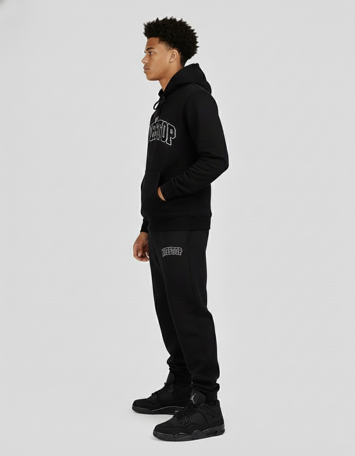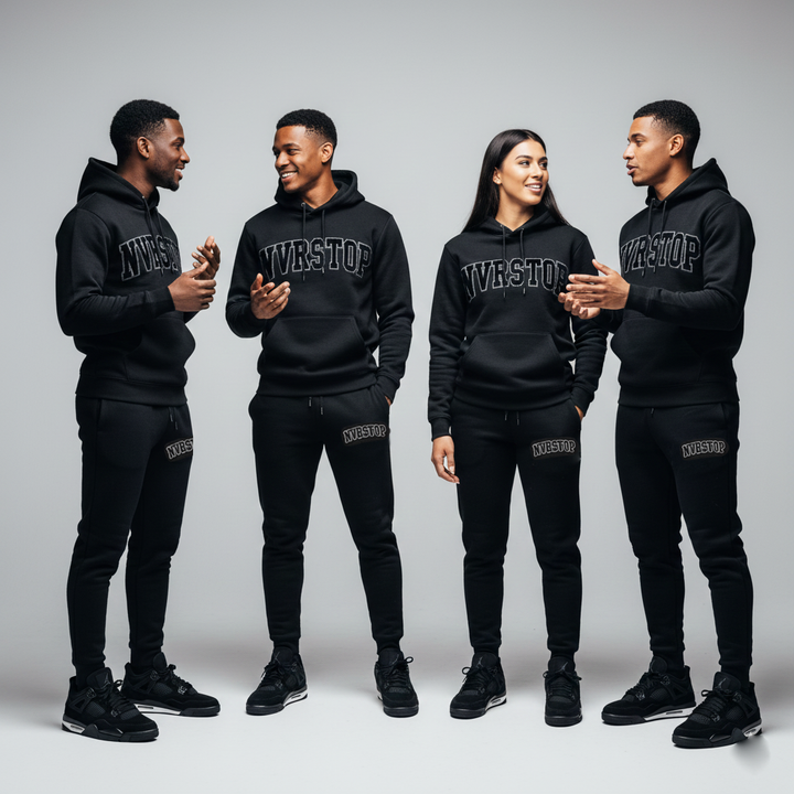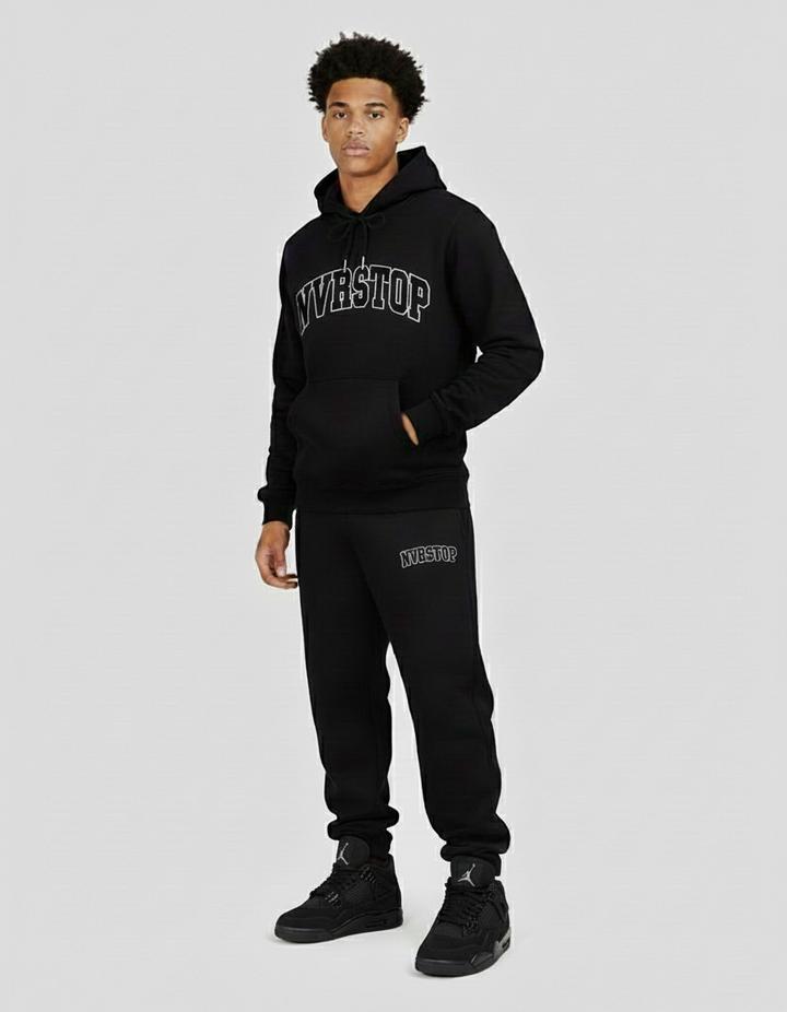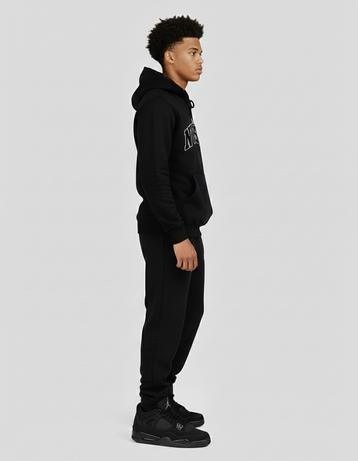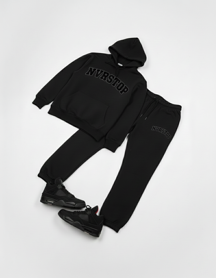 Bring the stealth look to life with the All-Black NVRSTOP Premium Sweatsuit, designed to match perfectly with the Air Jordan 4 Retro “Black Cat.”