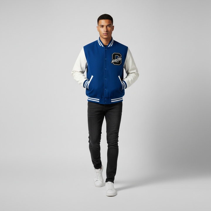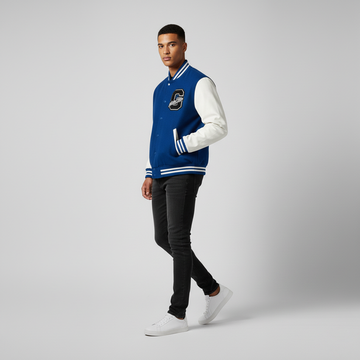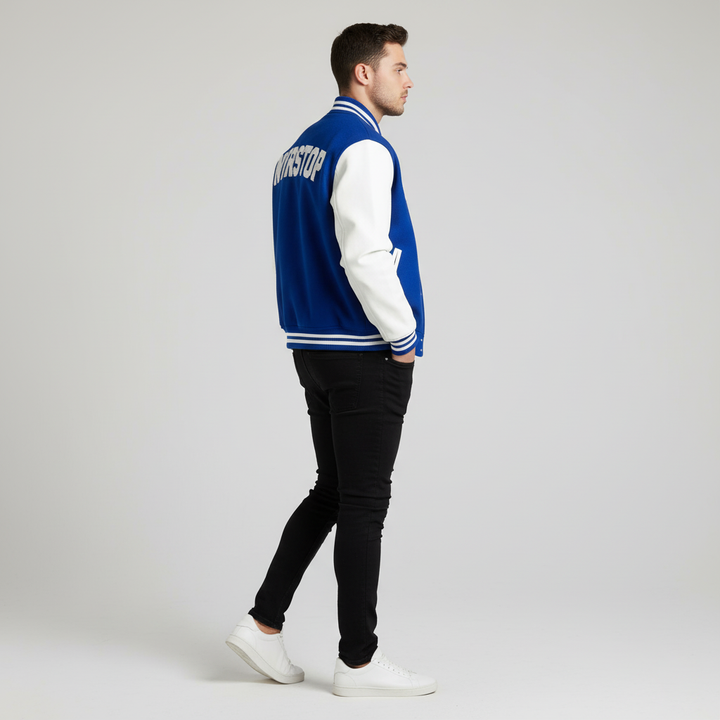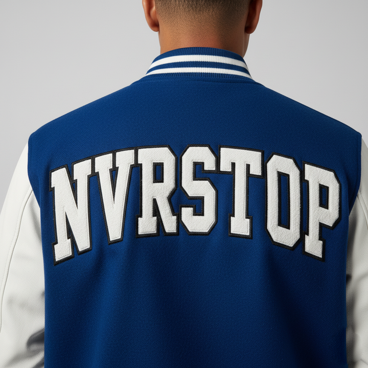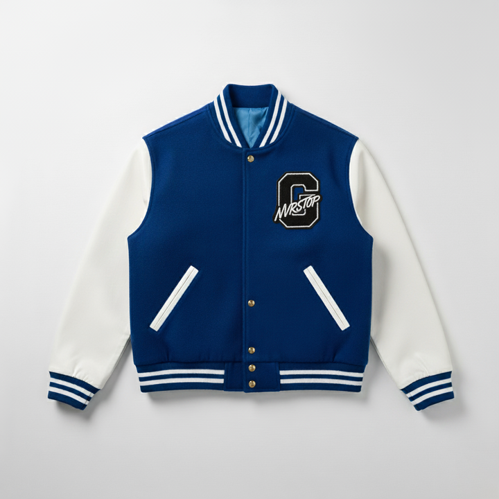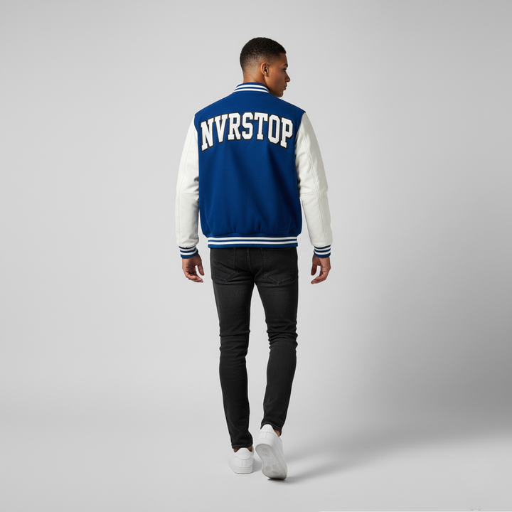 The NVRSTOP Varsity Jacket built from a black wool blend body and premium white leather sleeves, it delivers comfort, durability, and clean aesthetics — perfect for layering all year round.